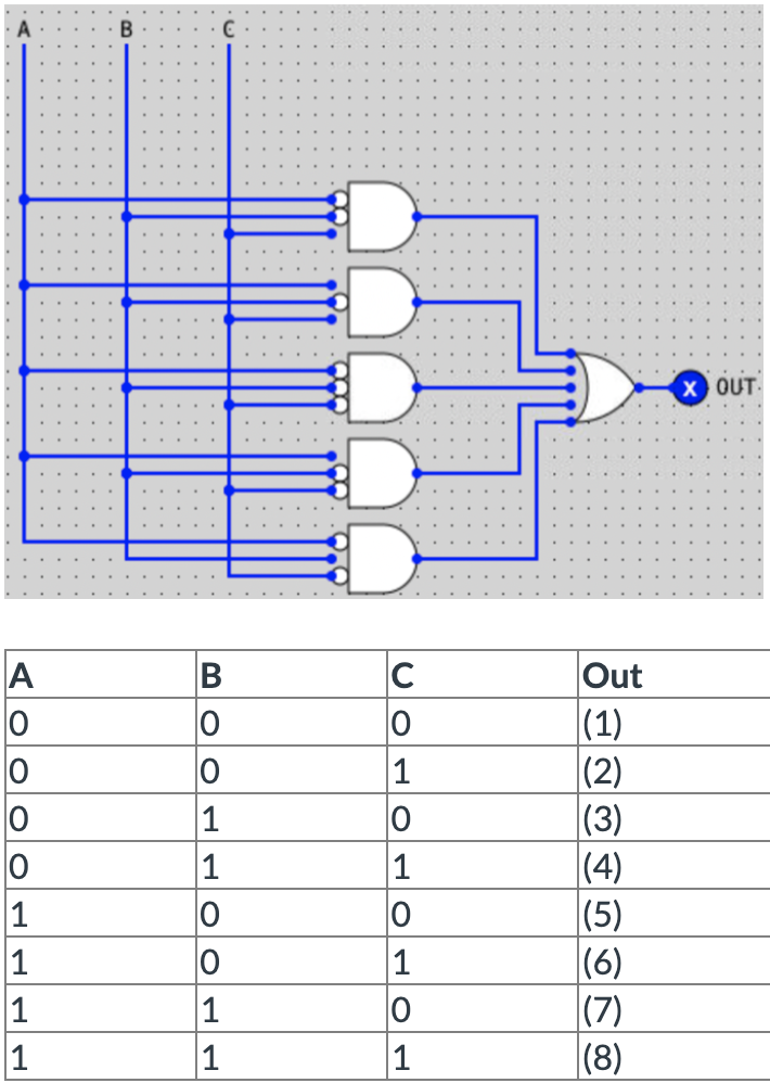- Based on the circuit below, fill in the “Out” column of the truth table. Use the dropdowns to select your answers. For example, if the cell with a (1) should be filled in with a 0, use the dropdown to select (1) = 0.