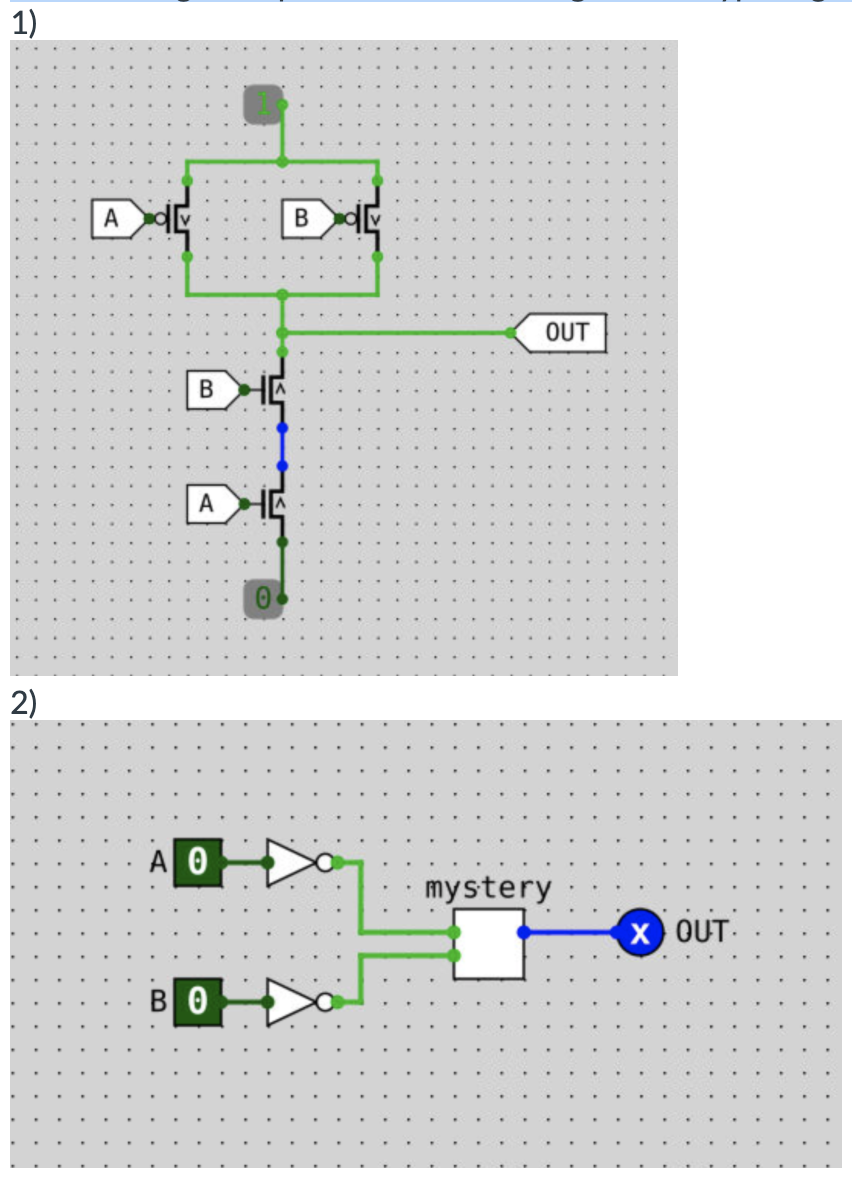 - What is the gate depicted in the first image? What type of gate can we replace mystery with in the second image to create a NOR gate?