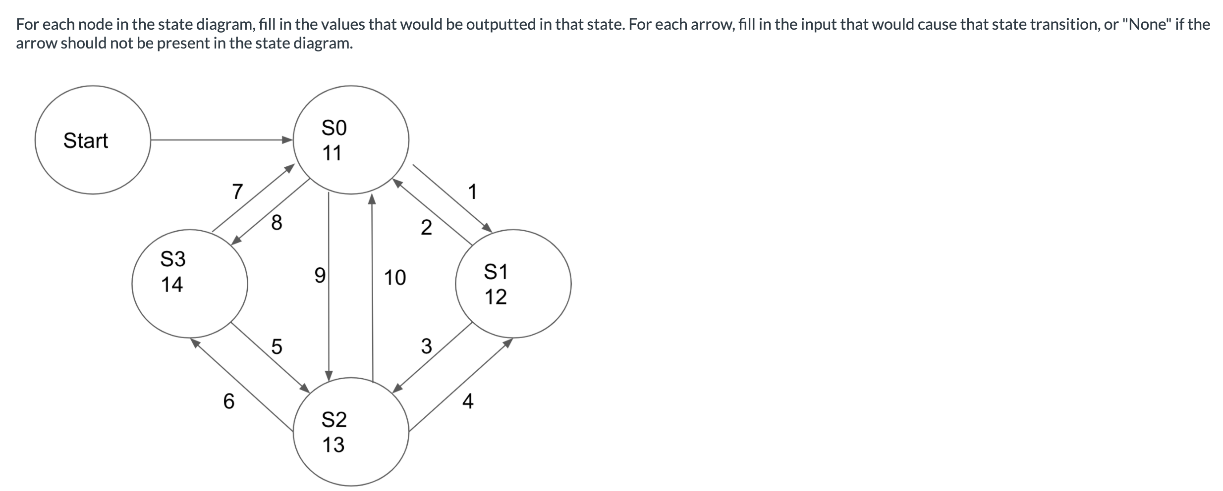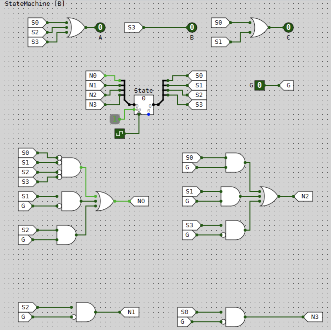 - [B] The circuit below implements a one-hot state machine. Your task is to fill in the blanks to recreate the state diagram of the state machine. Utilizing the circuit below, select an option for each numeric dropdown for what you think would go in that position in the state diagram (also shown below).