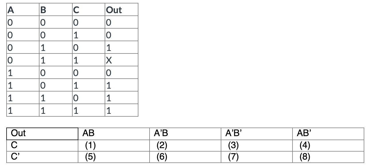 - Fill in this K-map according to the truth table above. Use the dropdowns to select your answers. For example, if the cell with a (1) should be filled in with a 0, use the dropdown to select (1) = 0.