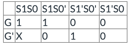 - From the above K-map, give the minimally reduced boolean expression in sum-of-products form. Don't add any spaces in your answer, and follow the S1/S0/G order of the headers for each term: e.g. "S1S0G+S1'G''" instead of "GS0S1 + G'S1'".