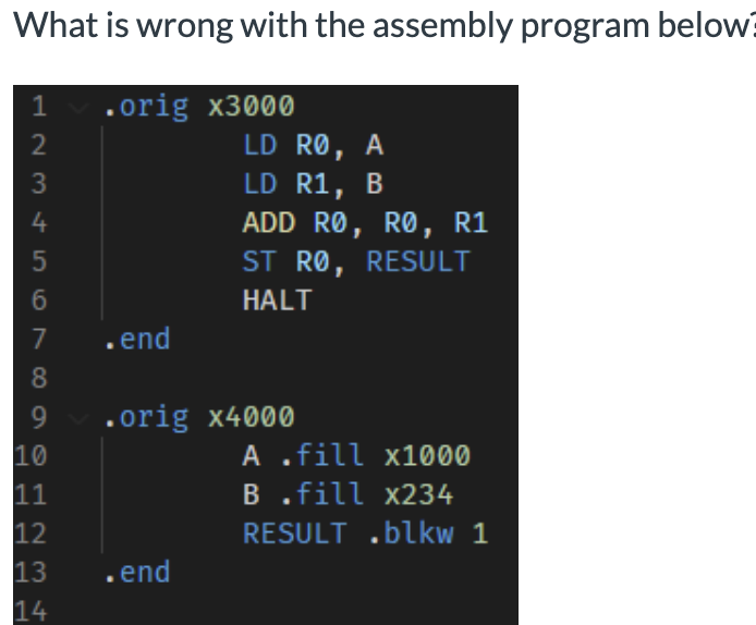 - In this question, you have to write a program with 5 instructions maximum. The template code is shown in the image below. You cannot use any extra psuedo-ops, TRAPs. Also, you can use registers R0-R2, but not any other ones.