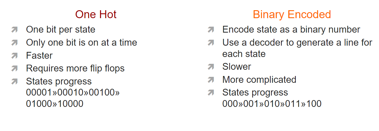 - For the binary-encoded state, the logic has to include a load of decoder logic to convert the binary value to a one-hot value before it can do the multiplexing.